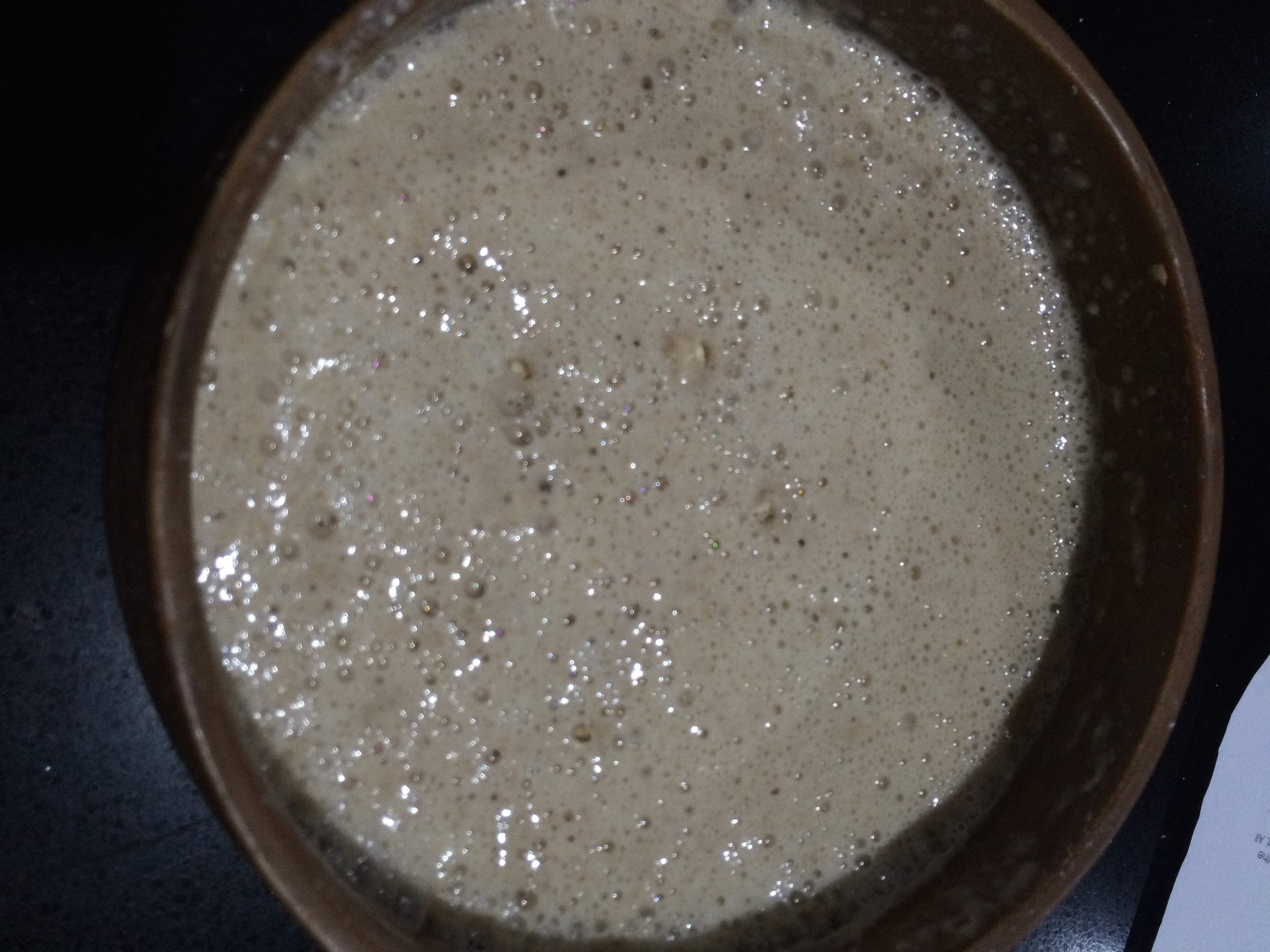 This is what an active starter looks like when ready to use. Nice and bubbly and you can see that the starter has started to deflate since there is a sludgy tide mark halfway up the side of the bowl.