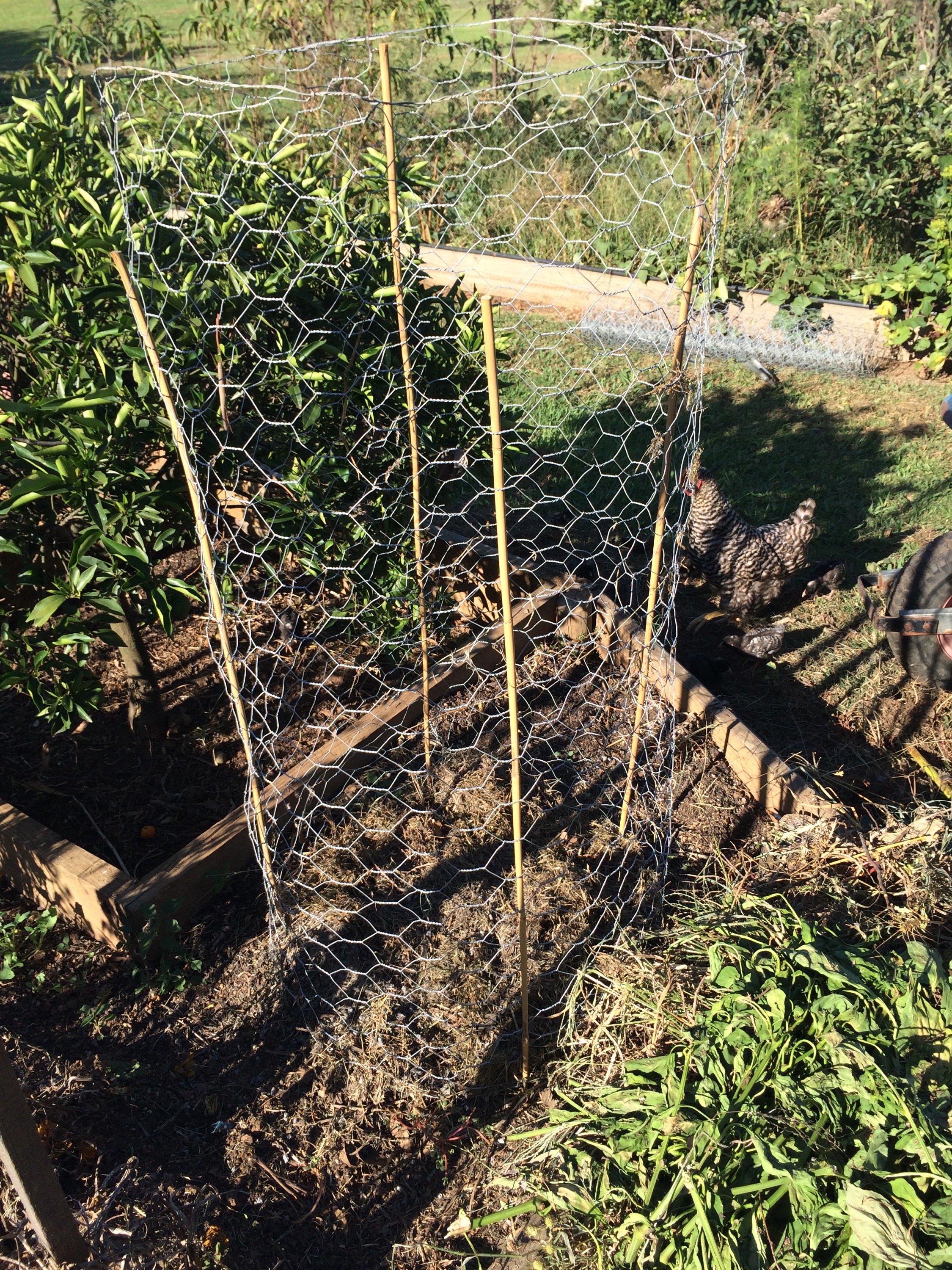 The wire basket is held in place by bamboo stakes and since we were being lazy, we used our electric mulcher to break down some weeds into a fresh mulch bed.